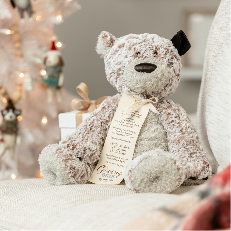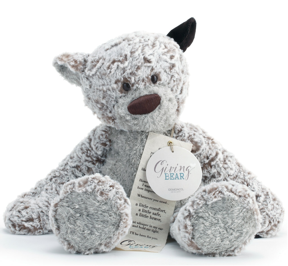 For the young or young at heart[Comma] Giving Bear is designed to be gifted to anyone in need of a little comfort[Comma] a little brave[Comma] a little safe. Everyone needs a hug[Comma] and that’s why this cuddly bear is silky soft and lovingly stuffed for endless hugs. Touchable[Comma] textured fabrics offer a soothing feel to this floppy companion. Weighted paws and extra-long arms make this plush teddy bear extra inviting[Comma] and his special corduroy ear is perfect for listening. A keepsake bookmark with a message of encouragement comes tied around Giving Bear’s neck to offer bravery and strength when it is needed most. Gift boxed. A DEMDACO Giving Bear is a friendly companion to remind the recipient that a friend is always near. A portion of the proceeds from the sales of this 16” Giving Bear will be donated to Children’s Mercy Hospital[Comma] Kansas City. Share a hug with someone you love.Materials: PolyesterDimensions: 8"" W x 10"" L x 16"" H