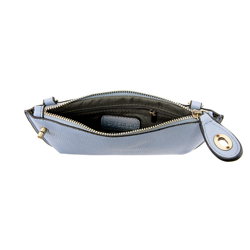 Joy Susan's most popular bag! This mini clutch in its fresh colors and sleek silhouette is as gorgeous as it is versatile. Features include a polished turn lock, six card slots and interior zipper for change. Can be styled in many ways, with removable straps for alternating between wallet, cross body and wristlet.